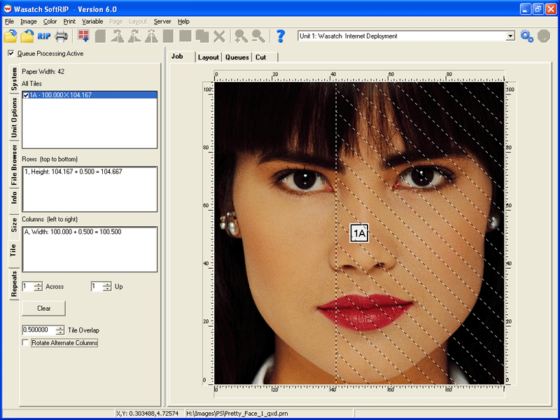 If you proceed to process the currently displayed job, jobs will be added to the RIP queue. Each entry will have a name that indicates its original position. If Rotate Alternate Columns is checked, alternate columns of tiles will be rotated by 180 degrees. This is valuable with print modes that produce slightly different colors at right and left edges, reducing the visibility of this effect when tiled jobs are assembled.