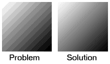 Expanded Tonal Resolution can provide substantial improvements to image quality. Resolutions considered high by traditional inkjet users are rather low when compared to 2000 and 4000 dpi imagesetters. When using one of these lower dpi (400, 600, or 720 dpi) devices to make color separations, a common problem is the limitation of "tonal resolution" or "available grays". This shows up as "tonal banding" on the film. When Expanded Tonal Resolution is not checked, your PostScript screens are limited by this formula: "maximum grays = (dpi / lpi) squared". The problem that can result from this limitation is illustrated by the "banded" gradient on the left.