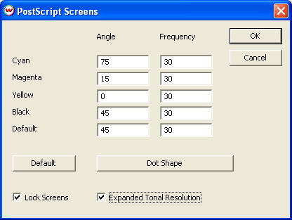 If only spot colors are being printed, or quality process color is not important, basic PostScript Screens may be sufficient. PostScript screen settings are controlled in the Halftone window on the Color Transforms screen.