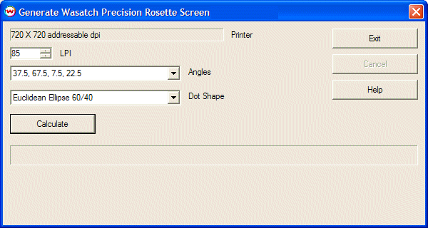 When a new Wasatch Precision Rosette Screen (WPRS) is needed, it can be created by pressing the button labeled Generate Screen on the main window for Wasatch Precision Rosette Screens.
