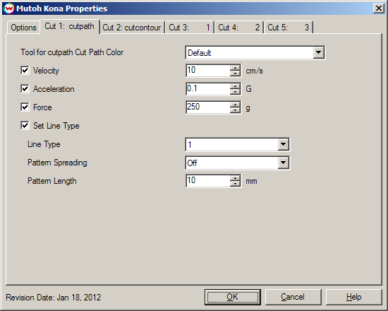 Checking the 'Use Different Setting for Each Cutpath Color' control will enable additional tabs at the top of the window for each additional cut path color, otherwise, 'Cut 1: Default' will be the only available tab.