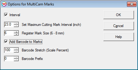 Note: Selecting the MultiCam Marks will place the proper registration marks on the print, in addition to barcodes printed with their appropriate file index number associated with the print. This barcode can then be scanned by the MultiCam software, and the appropriate cut file will be opened.