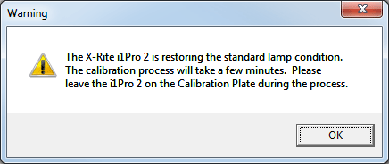 Calibration is required before scanning the target. Be sure to place the i1Pro 2 on the included white point reference before clicking the 'Calibrate' button. After you click on the 'Calibrate' button, the following message will be displayed: