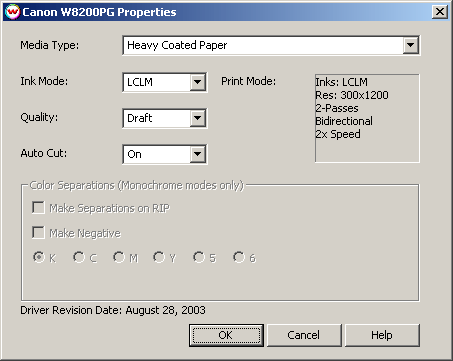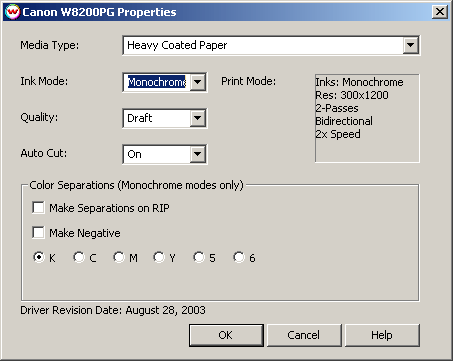 The Color Separations controls are the same as those of other printers, and are only available if a monochrome mode has been selected as the Ink Mode (See above).