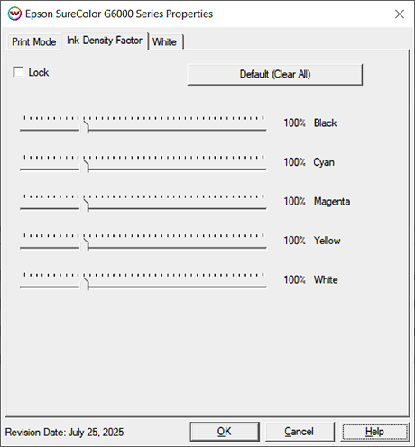 - Default (Clear All): Reset ink reduction slider to default position.