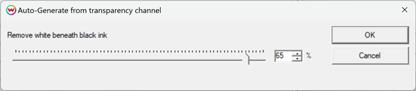 When this control is set to remove white beneath black ink, as is shown here at 65%, significant ink savings and improvements to "hand feel" may be realized.