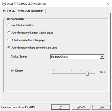 - Auto-Generate where other inks are used: Prints the white ink on all non-zero pixels(marked areas). In addition, a "choke" or "spread" may be selected.