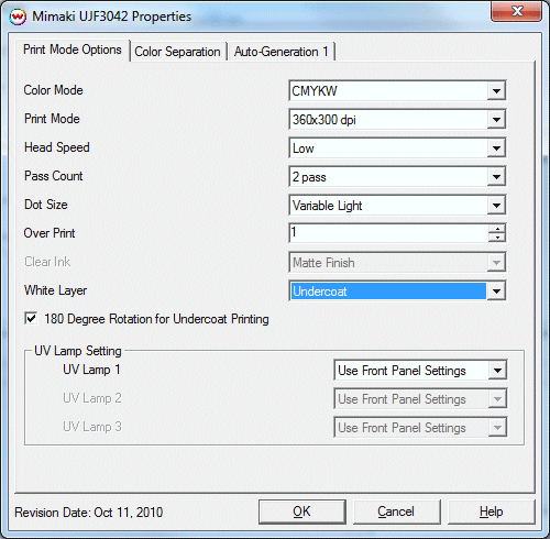 - UV Lamp Settings: Select the UV Lamp strength for each pass. Note: For Glossy finish of clear ink the lamp should be turned off when printing the clear ink.