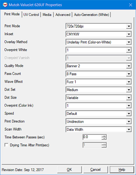 - Time Between Passes (sec): Allows you to specify the minimum time that a printhead pass will take. This may be necessary to slow down the printhead when there are excessive drying problems, or when printing separations onto film. For example, it may be necessary to increase the dot size to a larger dot to increase the maximum density.