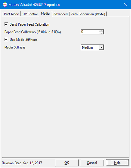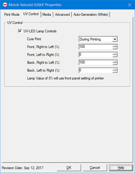 - Cure Print: Select whether to use the UV lamps to cure the ink during the printing process, or to rewind the media and have the UV lamps cure the ink after the printing has been completed.