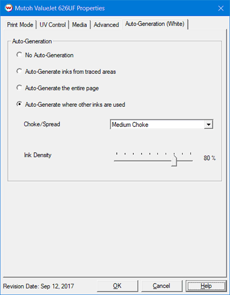 - Off: White ink will not be printed, unless specified on the Auto-Generation (White) tab.