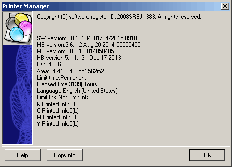 To confirm that the correct head board is used with the correct firmware, in the Printer Manager software, click on the Help button and select About. Then compare with the following:
