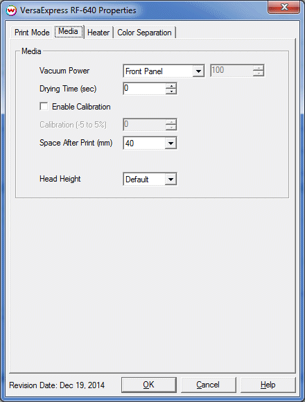 - Vacuum Power: Controls the suction on the media when printing. Media that tends to curl up when printing may require the 'Strong' setting.