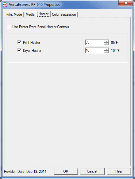 - Use Printer Front Panel Heater Controls: When enabled, all heater control is performed on the front panel. When disabled, the following controls will be active.