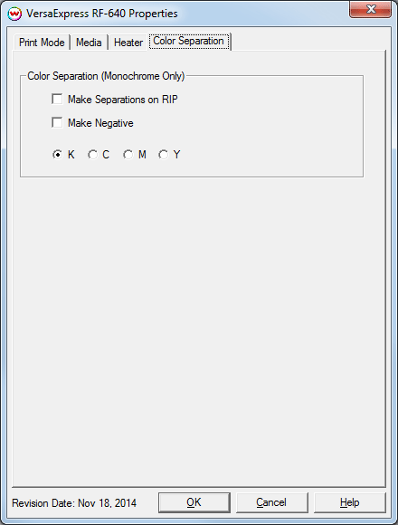 The Color Separation controls are the same as those of other printers, and are only available if a monochrome mode has been selected on the Print Mode tab.