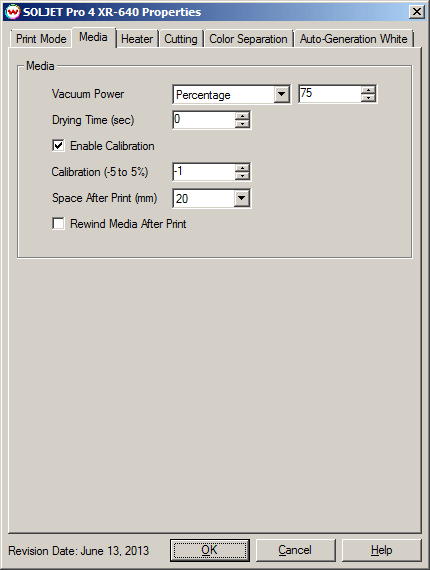 - Vacuum Power: Controls the suction on the media when printing. Media that tends to curl up when printing may require the 'Strong' setting.