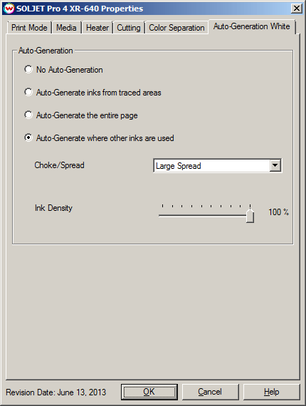 - Auto-Generate where other inks are used: Prints the unmanaged channel (white) on all non-zero pixels(marked areas). In addition, a "choke" or "spread" may be selected.