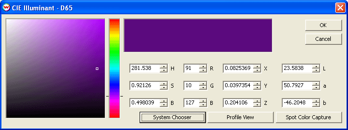 Spot Color Capture allows you to directly record custom spot colors from a swatchbook or other type of color sample…simply by clicking on it with your handheld colorimeter. This process is initiated by clicking on the Spot Color Capture button on the CIE Illuminant menu shown in Illustration 1. This will launch the appropriate wizard for the colorimeter you select. Once the color is read in, the CIE Lab values are entered automatically in SoftRIP's Color Database utility.