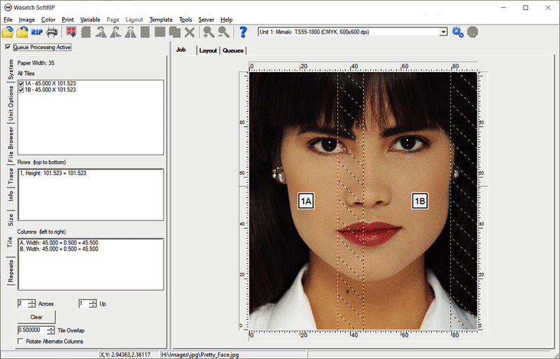 If you proceed to process the currently displayed job, jobs will be added to the RIP queue. Each entry will have a name that indicates its original position. If Rotate Alternate Columns is checked, alternate columns of tiles will be rotated by 180 degrees. This is valuable with print modes that produce slightly different colors at right and left edges, reducing the visibility of this effect when tiled jobs are assembled.